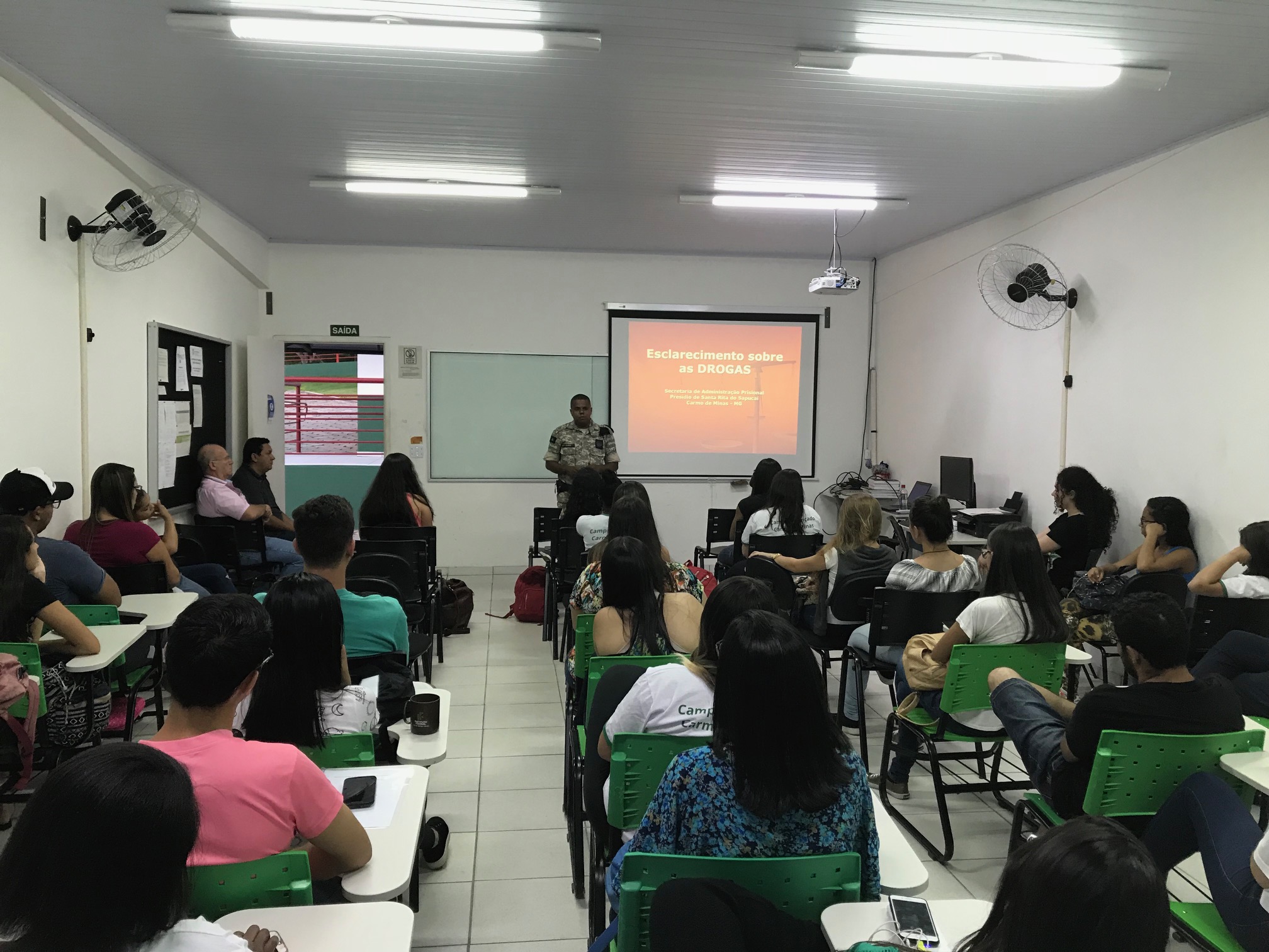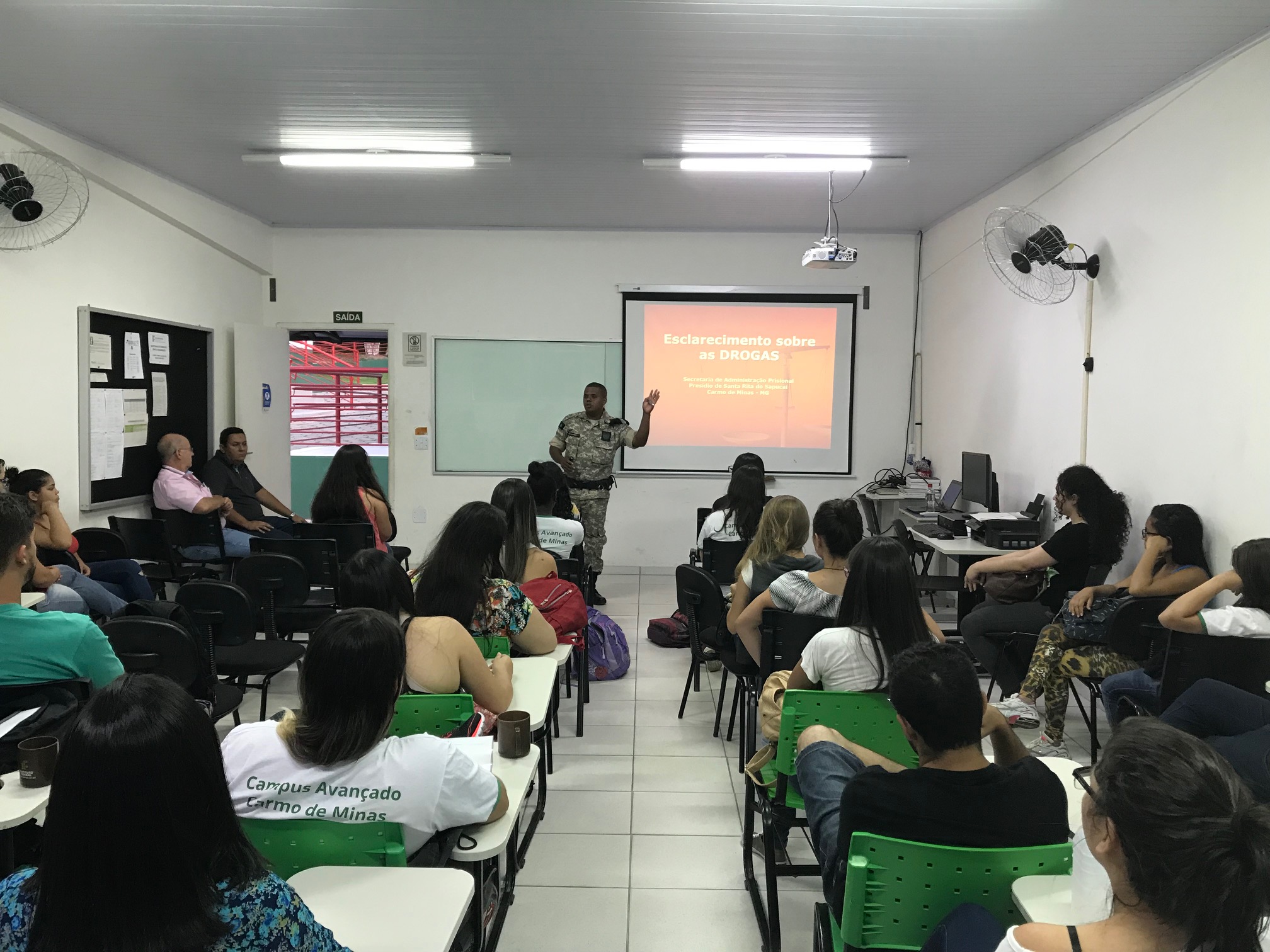 Dentro das atividades propostas pela Reitoria e pelos outros Campis de ações de combate e conscientização quanto ao uso de Drogas (Lícitas e Ilícitas) do IFSULDEMINAS, a comissão do Campus Avançado de Carmo de Minas representada pelo Prof. Joyce Alves de Oliveira juntamente com o DEPE representado pelo Prof. Luiz Gustavo de Mello e demais professores, promoveu a realização de duas palestras de uma hora cada de ações de combate ao uso de Drogas no dia 14 de novembro de 2017 envolvendo as partes legais e os diversos tipos de crimes que estão envolvidos os usuários e traficantes (principalmente na escola) pelo Dr. Leandro Francisco Pereira Diretor Adjunto da Secretaria de Administração Prisional – do Presídio de Santa Rita do Sapucaí para os alunos do ensino médio integrado (diurno) e para os alunos dos cursos subsequentes de Alimentos e Administração (noturno).